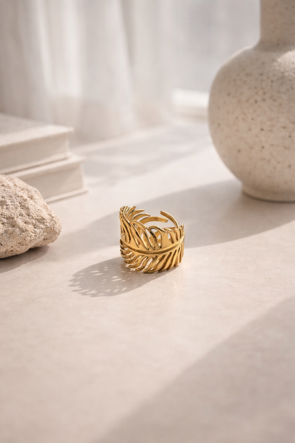 Anello in acciaio gold dal design avvolgente ispirato alle forme naturali delle foglie. Regolabile, luminoso e leggero, è il dettaglio perfetto per dare carattere anche al look più semplice. Da indossare ogni giorno, senza pensieri.