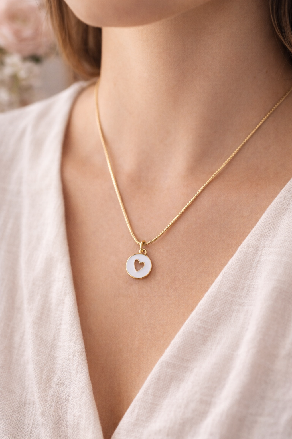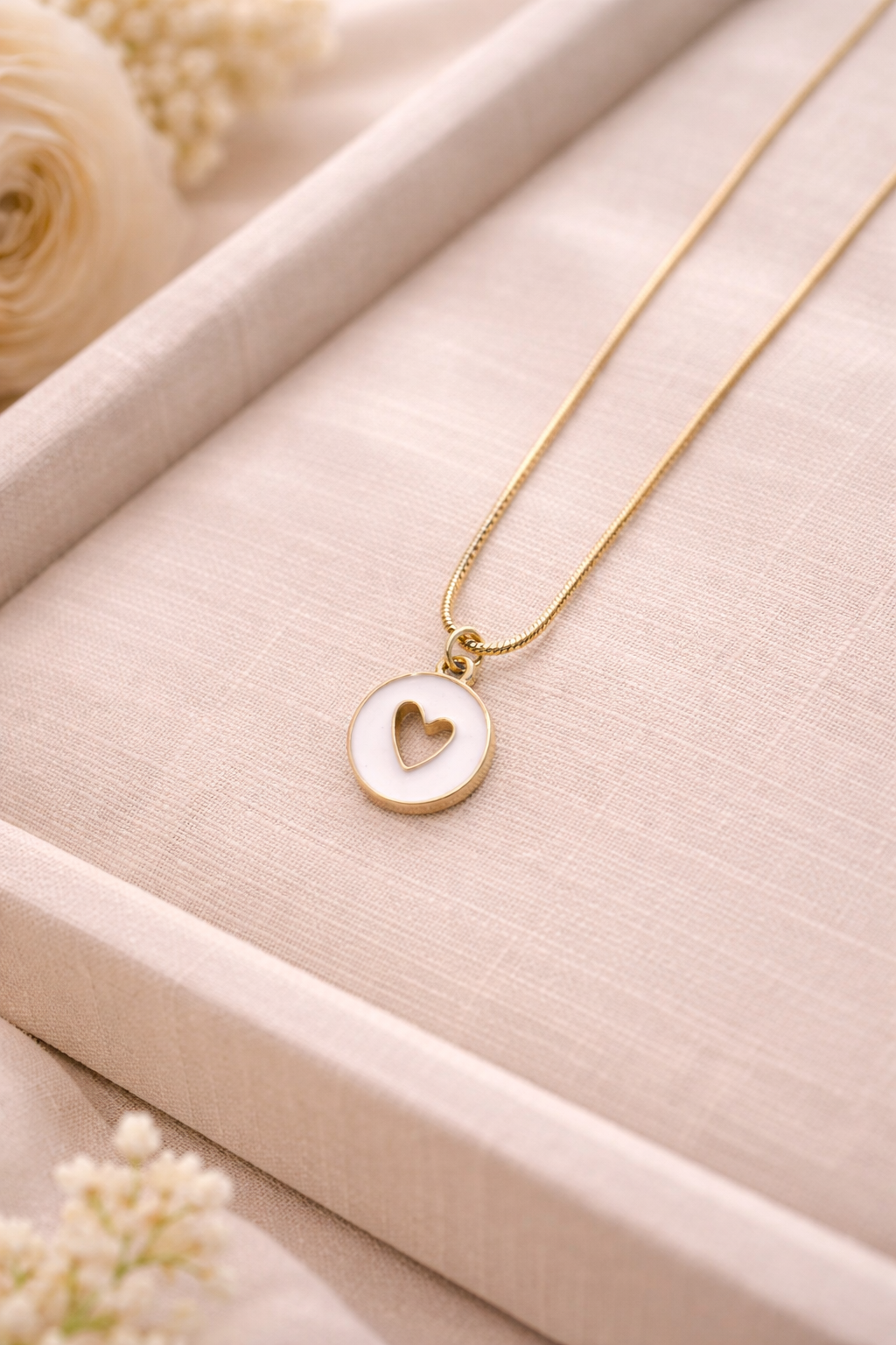 Questa collana in acciaio è impreziosita da un piccolo ciondolo tondo smaltato, con un cuore dorato scavato al centro: un dettaglio romantico ma essenziale, pensato per accompagnarti ogni giorno.