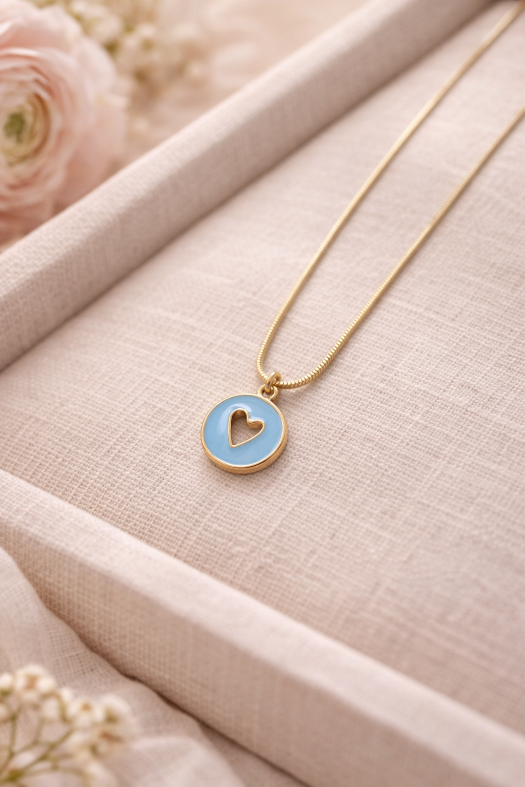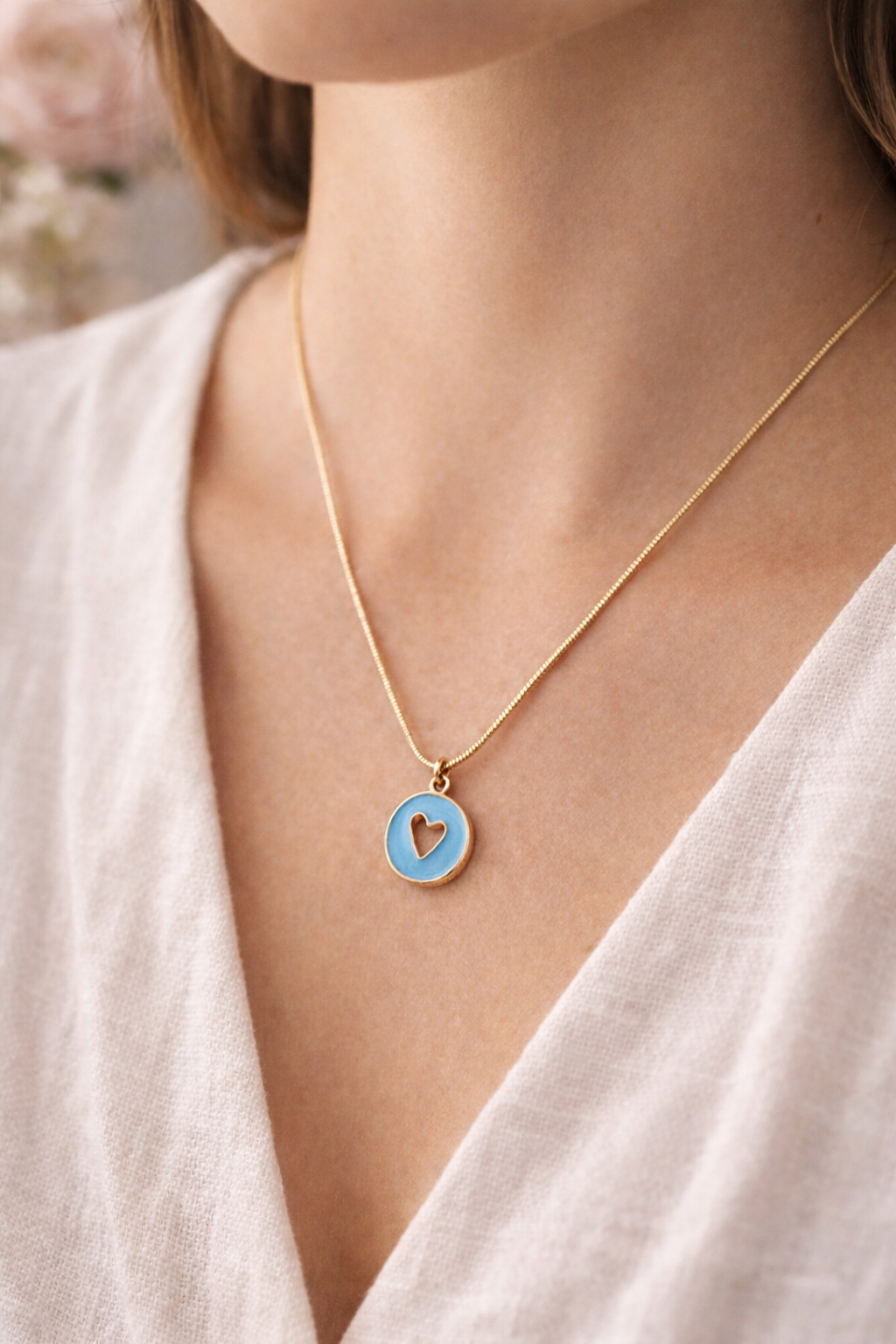 Questa collana in acciaio è impreziosita da un piccolo ciondolo tondo smaltato, con un cuore dorato scavato al centro: un dettaglio romantico ma essenziale, pensato per accompagnarti ogni giorno.